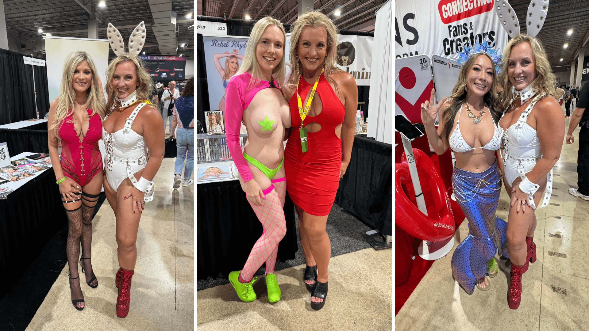 We checked in, picked up our credentials and wouldn’t you know it, the first thing we saw was a stripper pole, but of course, everyone’s “goodies” had to stay covered. The room was a huge conference space with nothing but rows and rows of tables and booths full of all kinds of advertisements. As a matter, of fact, if you didn’t know any better, you would think that you were at any other regular conference exhibit except all the sexy people with tiny clothes on! In the middle of the room, there was quite a large computer setup full of sexy content creators. All weekend long different content creators in beautiful lingerie did live sessions on Chaturbate. Once we made our way to the back of the room, there was a large stage with live performances going on most of the day. Some of the most flexible and talented dancers I’ve ever seen performed all weekend long.